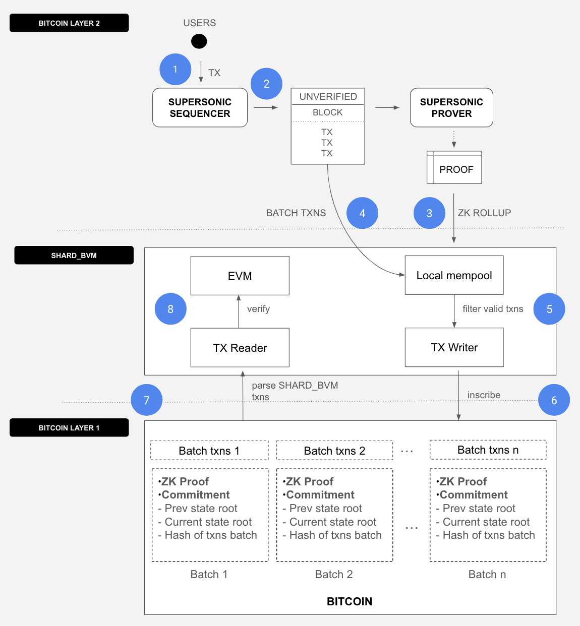 4. The Supersonic Sequencer also submits the block’s transactions to Bitcoin by sending another transaction to the SHARD\_BVM metaprotocol. Bitcoin now serves as a Data Availability layer for Supersonic, storing its state commitments, zk proofs, and batches of transactions.&#x20;